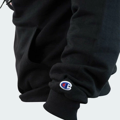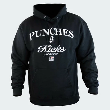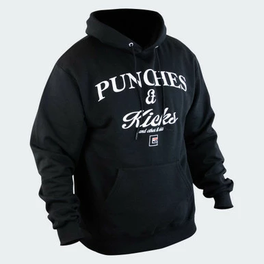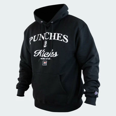 Punches & Kicks design by Combat Corner printed on a premium Champion® hooded sweatshirt. 2 brands meet to make a refinned product that stands out from the rest. *Warning* Explicit content wording on shirt says “Punches & Kicks… and other ill shit”